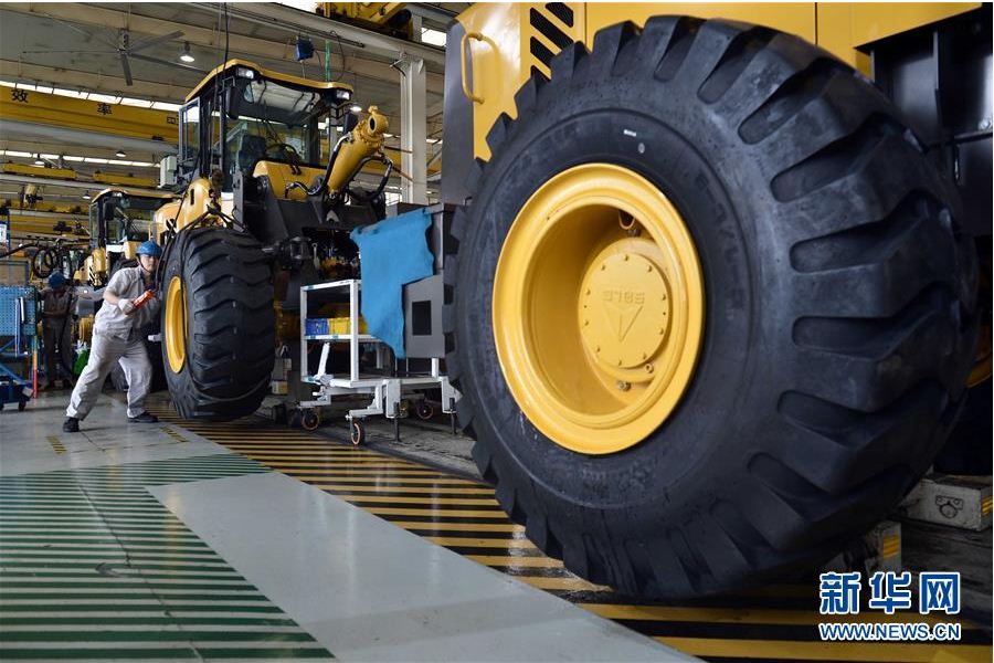在山东银河游戏(中国)有限公司工程机械有限公司,工人在装载机生产线作业